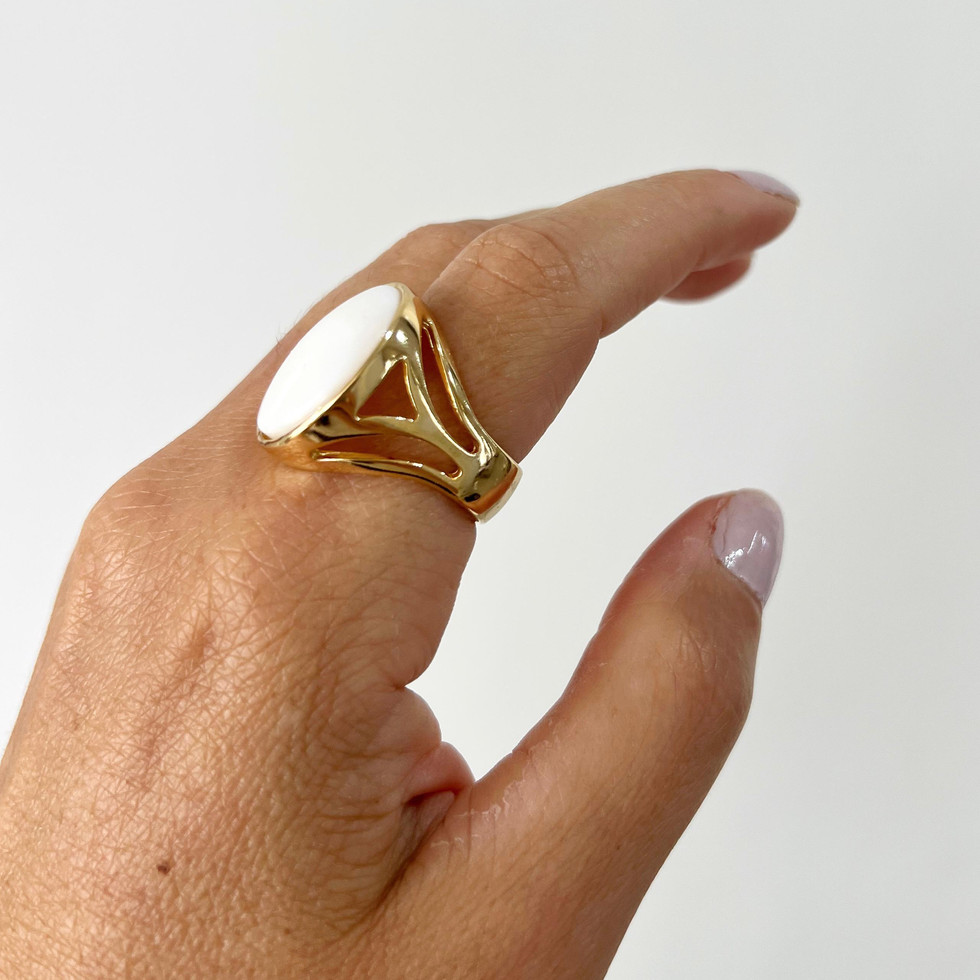 Clássico e sofisticado, este anel dourado destaca a beleza suave da madrepérola, com seu brilho acetinado e acabamento delicado. A superfície lisa e luminosa valoriza o design clean da peça, criando um visual elegante e atemporal.