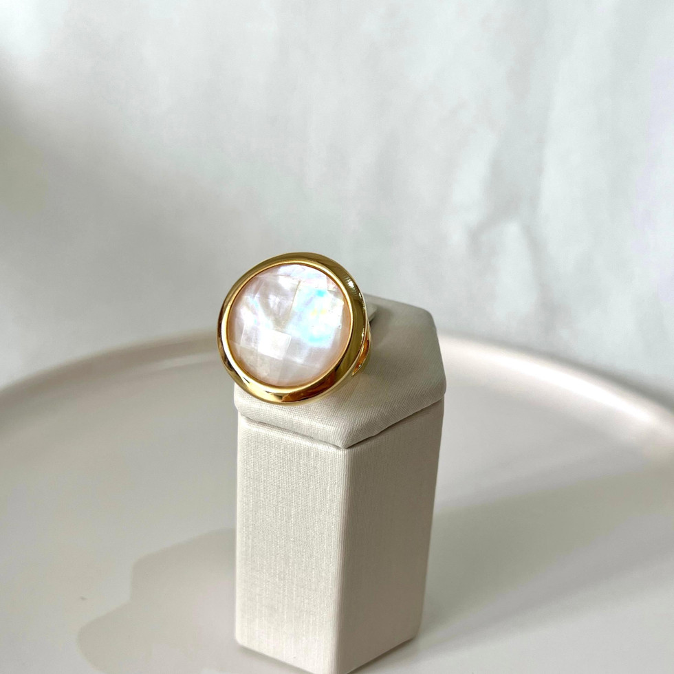 Delicado e sofisticado, este anel dourado destaca a beleza única da madrepérola rosa, que reflete tons suaves e luminosos a cada movimento. Sua superfície iridescente traz um efeito elegante e feminino, perfeito para quem valoriza peças com charme natural.