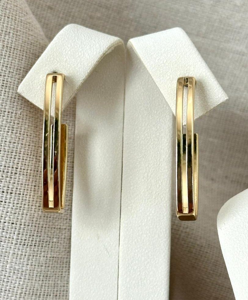 Moderno e sofisticado, este brinco dourado se destaca pelo seu design duplo que cria um efeito visual elegante e contemporâneo. As linhas paralelas trazem leveza e movimento à peça, enquanto o acabamento polido garante um brilho refinado.