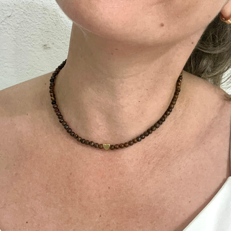 Sofisticado e atemporal, este colar é composto por esferas de olho de tigre natural, pedra conhecida por seus tons quentes que variam entre o marrom e o dourado, criando um brilho único e marcante.