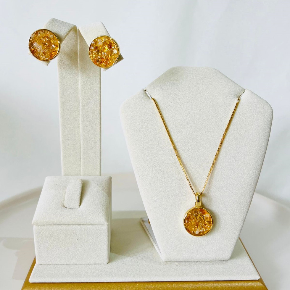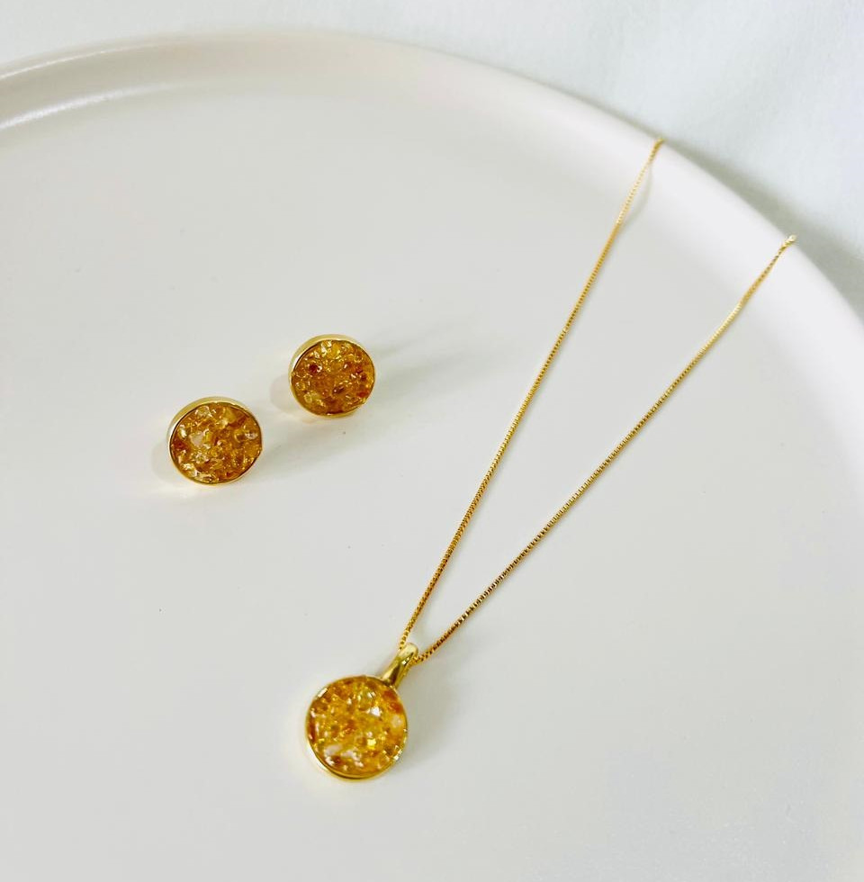Vibrante e sofisticado, este conjunto dourado se destaca pelos fragmentos de citrino em tom dourado intenso, que trazem textura e brilho únicos à peça. O efeito dos fragmentos cria um visual marcante e cheio de personalidade, valorizando cada detalhe com elegância.